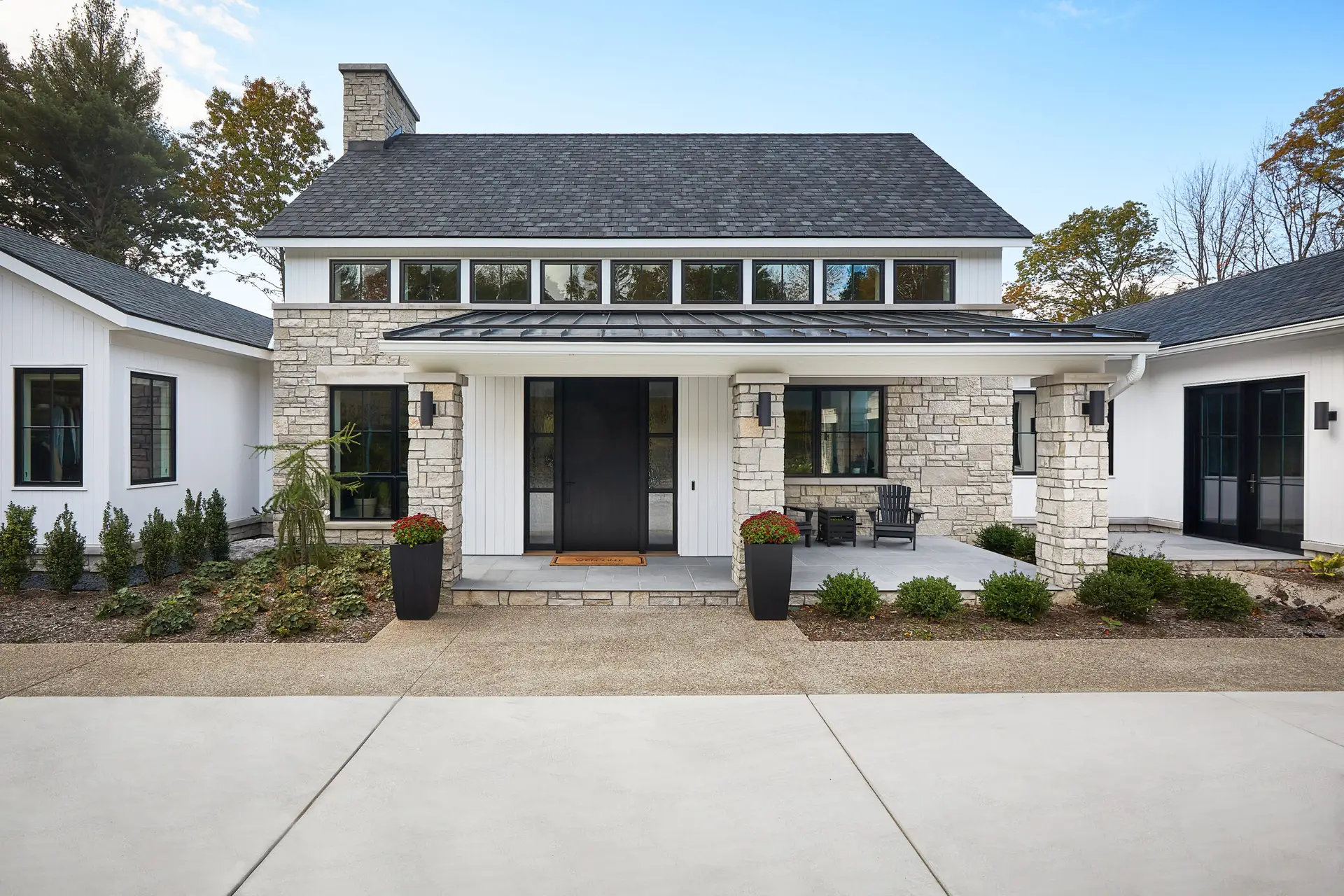 At the center of the home, the great room is a space made for connection. A soaring stone fireplace invites cozy mornings and late-night conversations, its firelight dancing across wide-plank hardwood floors. Just beyond, the open kitchen isn’t just for cooking—it’s where stories are told over a glass of wine, where meals are prepared with love, and where the oversized island becomes the perfect gathering spot. Sleek quartz countertops, custom cabinetry, and a farmhouse dining table create a space that is both functional and welcoming. Studio M worked closely with our clients to make sure every element felt intentional, blending beauty with practicality to create a home that invites people to stay, relax, and enjoy the moment.